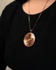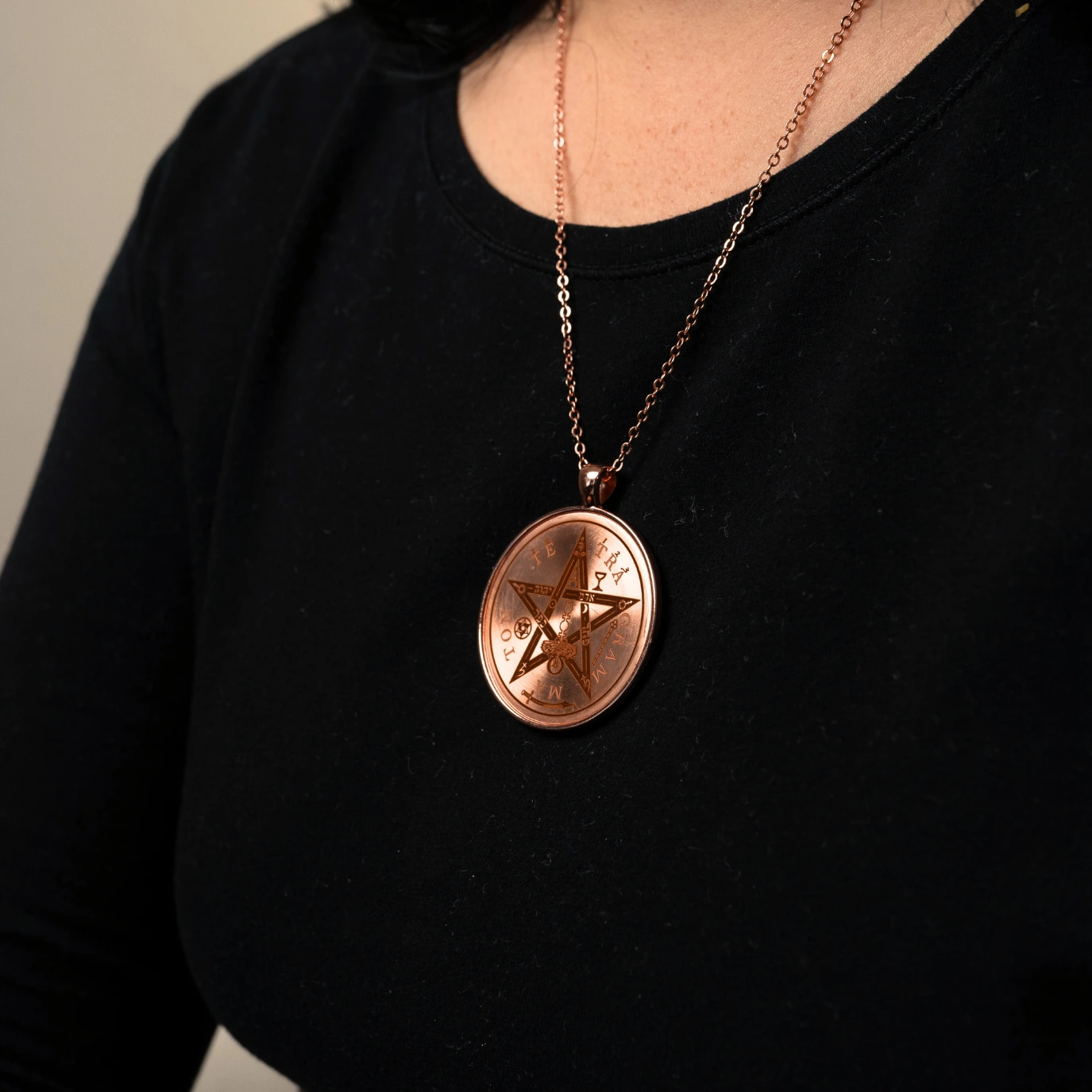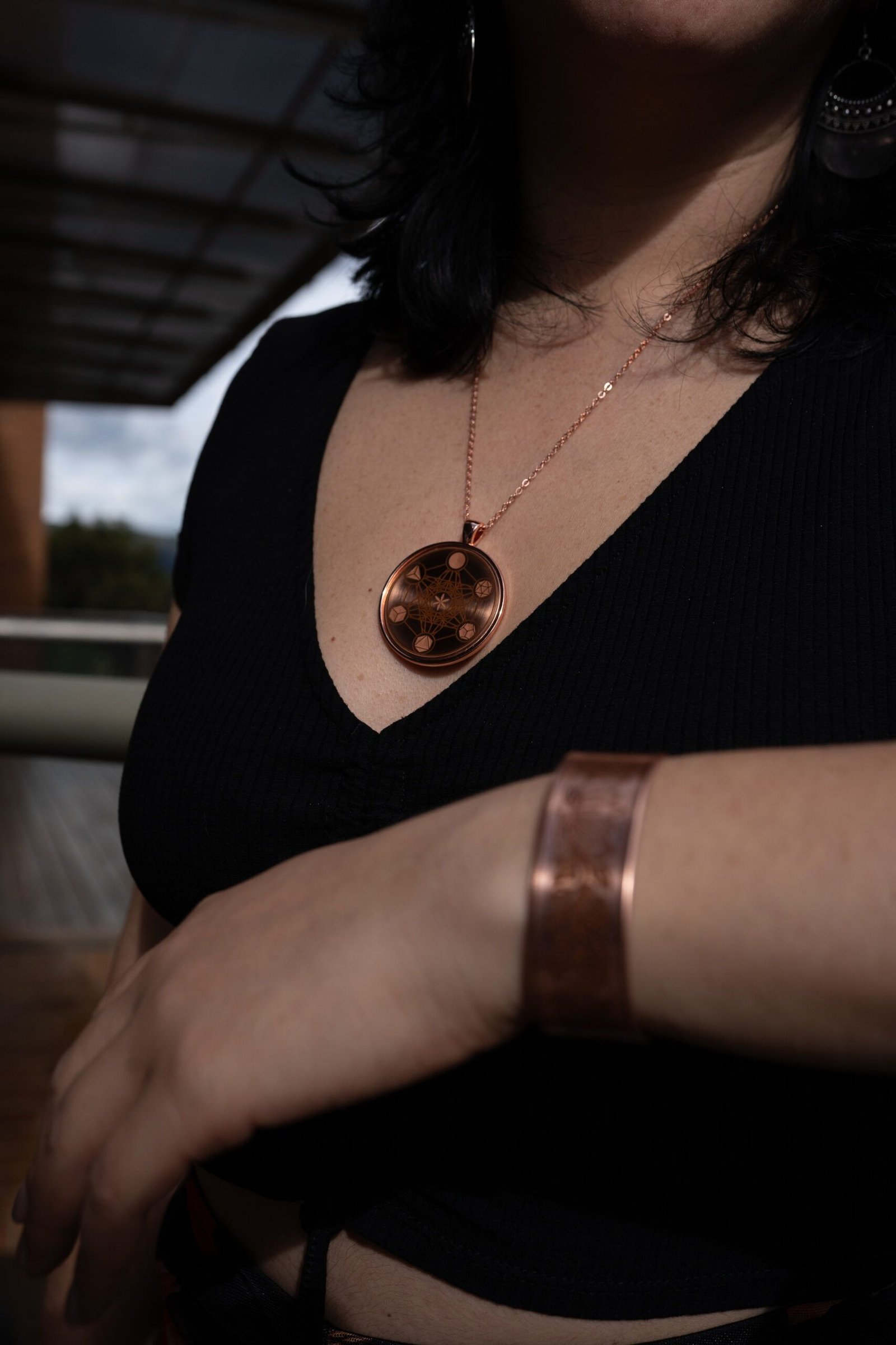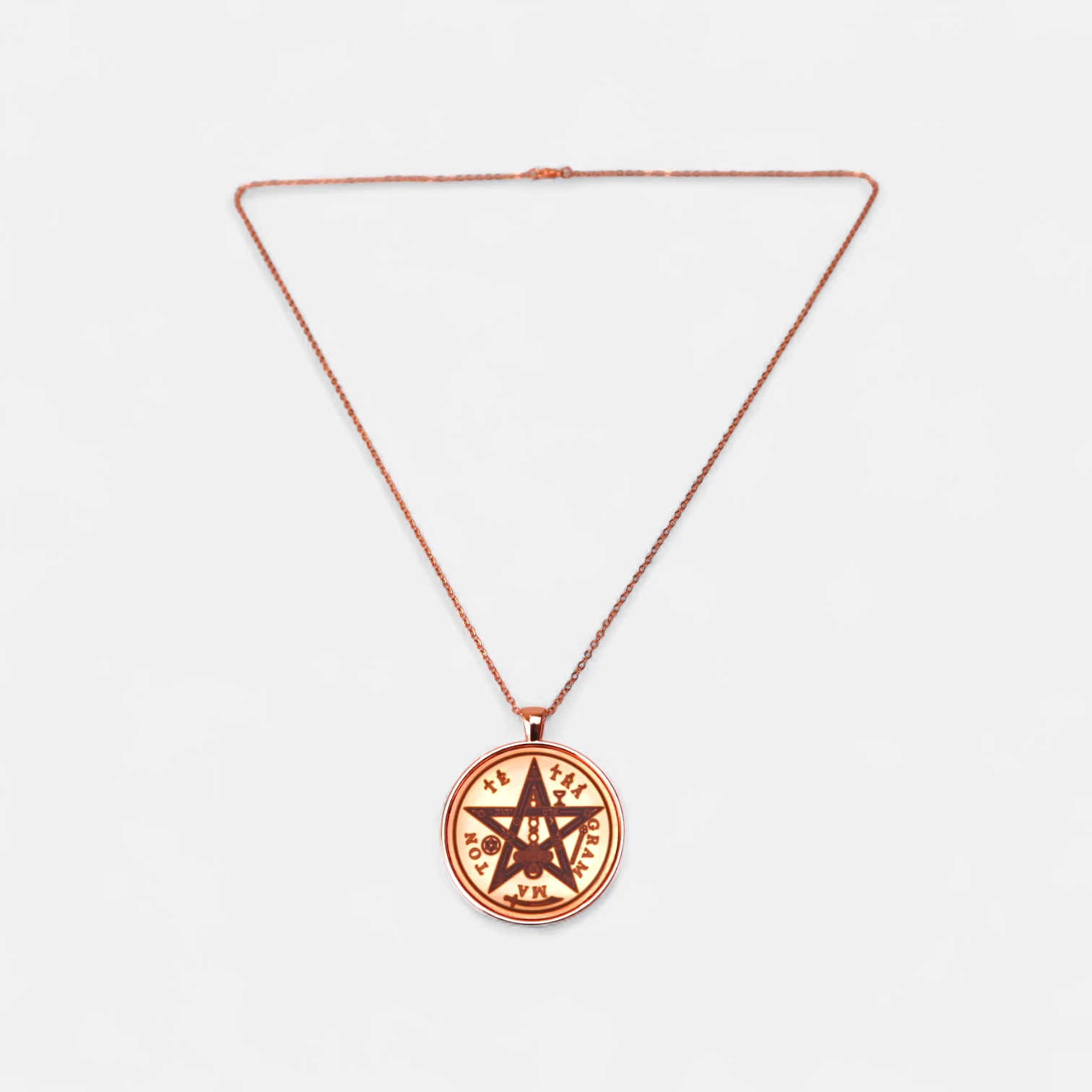 Este dije está diseñado para quienes buscan un amuleto elegante y poderoso a la vez. El disco central en cobre puro está montado sobre un cabujón metálico color cobre brillante, lo que le da un acabado moderno y refinado.