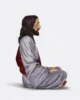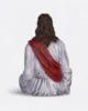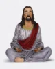 Jesús está sentado en una postura meditativa con las piernas cruzadas y las manos descansando sobre las rodillas, mostrando una profunda tranquilidad con su imponente altura.