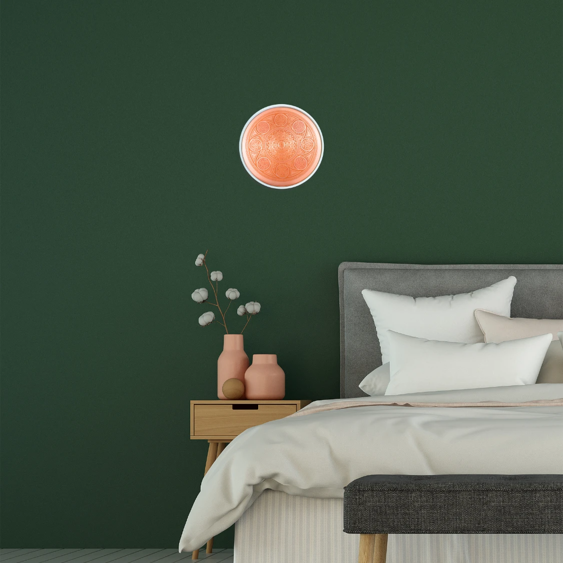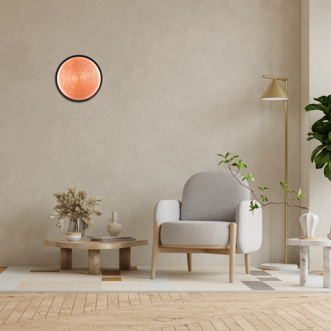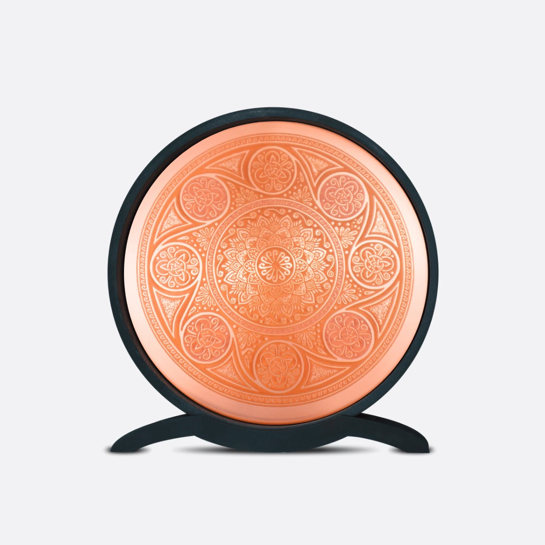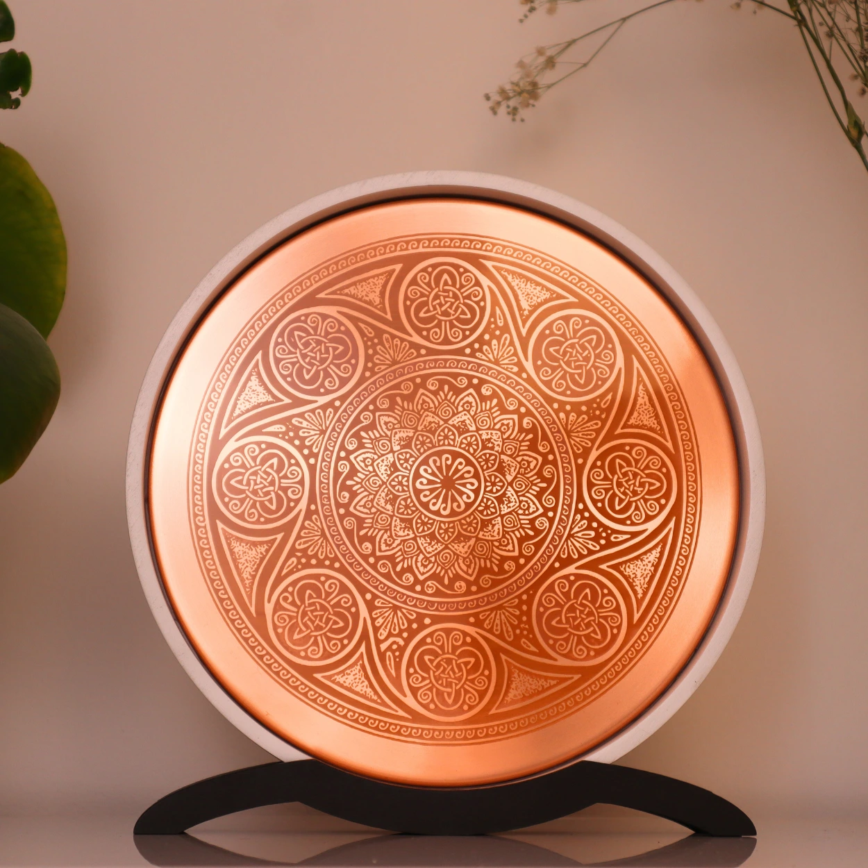 El cobre puro utilizado en su fabricación no solo resalta su estética refinada, sino que también es un material cargado de propiedades energéticas y durabilidad, aportando una sensación de calma y profundidad a cualquier espacio.