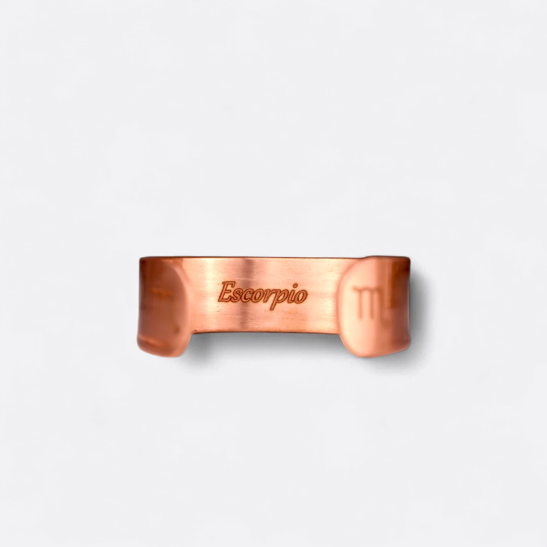 El cobre ayuda a equilibrar la energía del cuerpo y a liberar bloqueos emocionales, fomentando una sensación de claridad y poder personal. Su brillo cálido evoca el fuego interior que impulsa a Escorpio a renacer una y otra vez con mayor sabiduría.