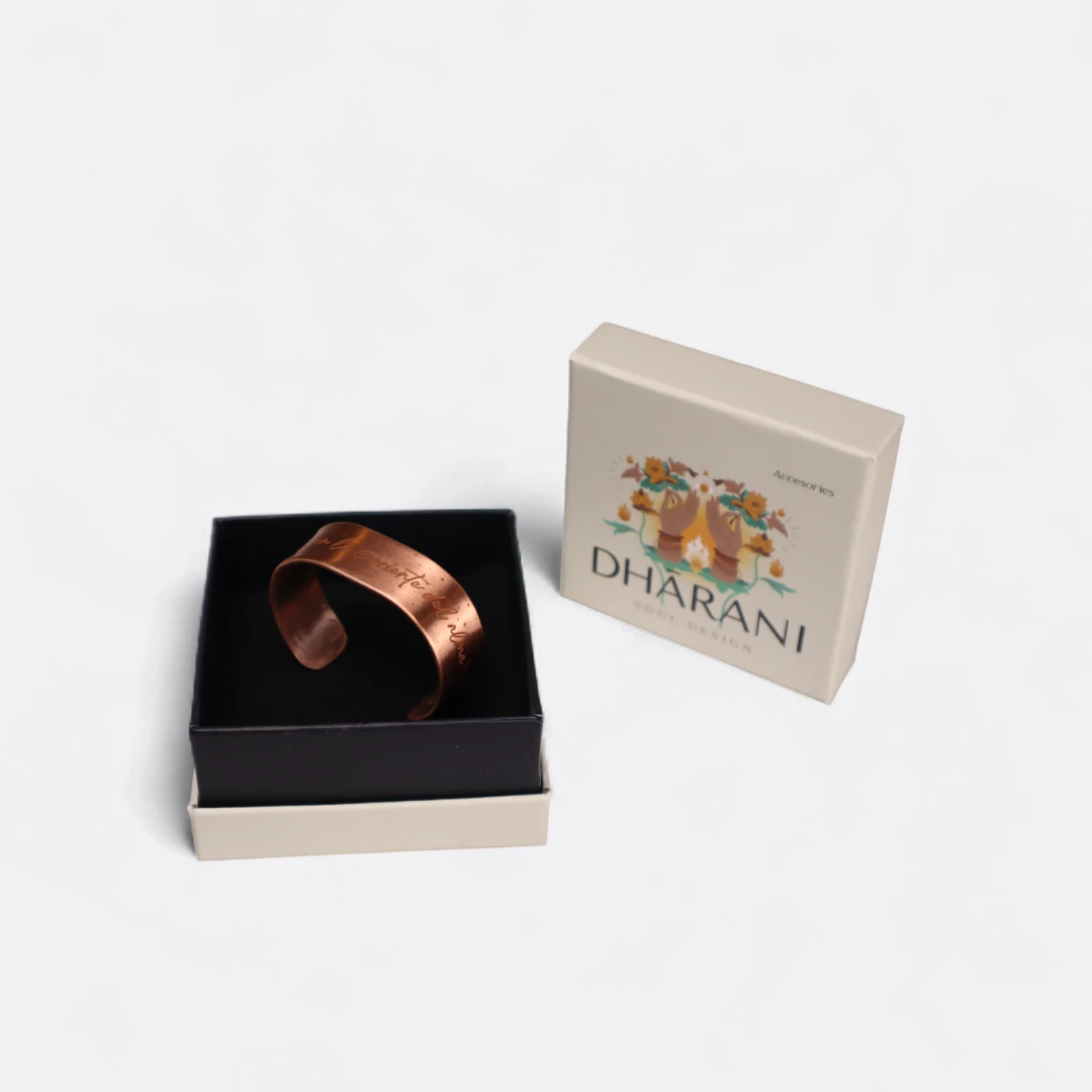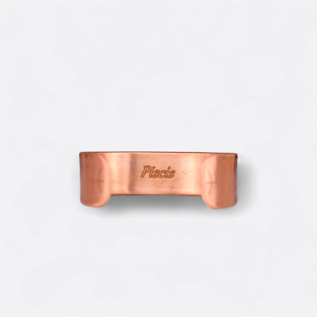 El cobre favorece la purificación energética y ayuda a mantener el equilibrio entre el mundo interior y exterior, guiando al alma pisciana a fluir con confianza y sensibilidad. Su diseño artesanal evoca el movimiento del agua, recordando la capacidad de Piscis para adaptarse y sanar a través del amor y la intuición.